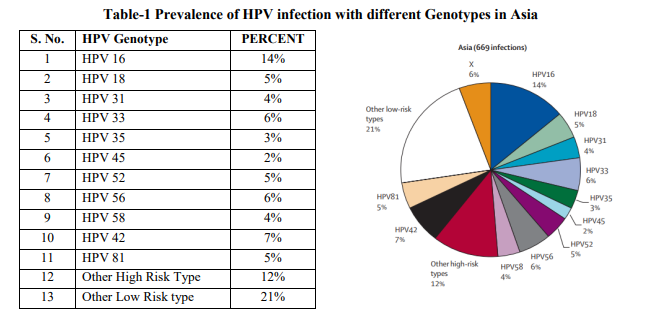 Table 1 shows the prevalence of HPV infection with different Genotype in Asia region. HPV16 was twice as frequent as any other high-risk type. The next most common high-risk types were HPV33 and HPV56 in Asia.